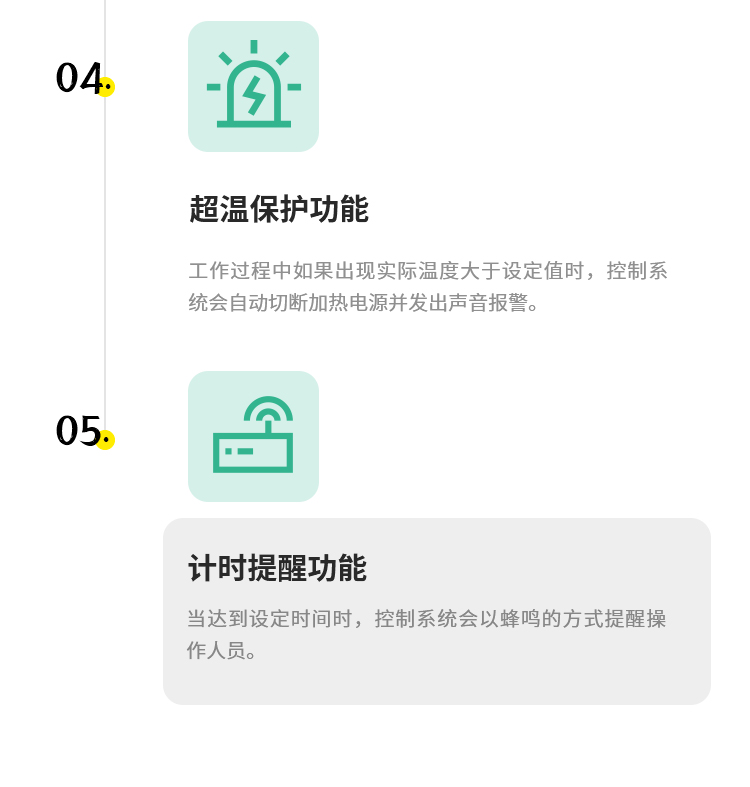 超溫保護(hù)功能:工作過程中如果出現(xiàn)實(shí)際溫度大于設(shè)定值時(shí),控制系統(tǒng)會自動切斷加熱電源并發(fā)出聲音報(bào)警。